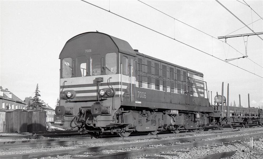 Deze locomotief behoort tot de reeks 70, een reeks van diesellocomotieven van de NMBS voor de zware rangeerdienst. Zij sleept een platte wagen met rongen. Links van de locomotief zien we kleine werfketen, typisch voor deze periode Schenking van Myriam Hendrickx.