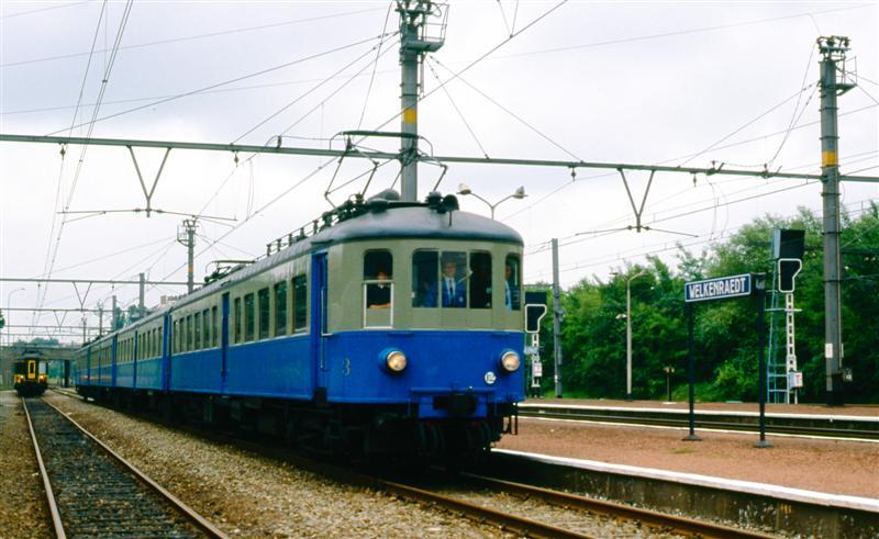 Deze fotogroep bevat twee dia's. Een motorstel uit 1935 komt aan in het station Welkenraedt. We zien de perrons, enkele lichtseinen en een stationsnaambord. Op het naastliggende spoor rijdt een motorstel van het type 1954. Schenking van Myriam Hendrickx.