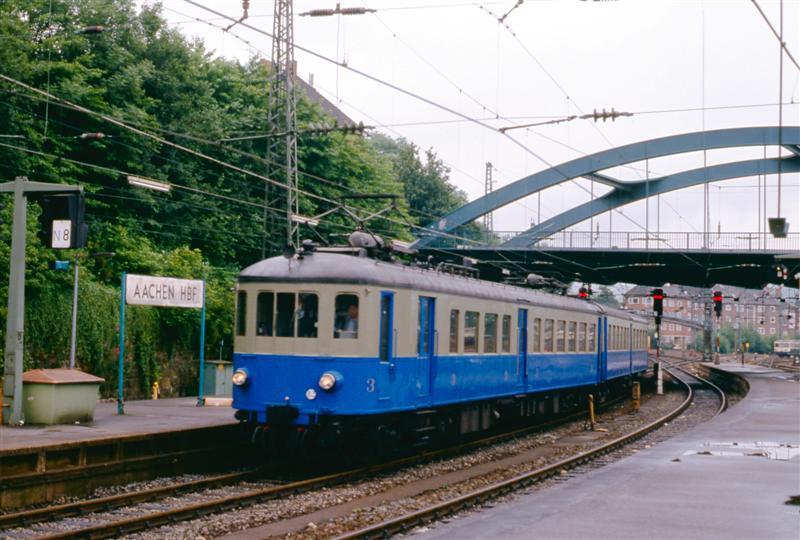 Deze fotogroep bevat vijf dia's. Een motorstel type 1935 is aangekomen in het hoofdstation van Aken. Op enkele foto's is de perronoverkapping te zien, één foto is genomen vanop een brug over de spoorweg en geeft een goed beeld van het sporencomplex bij het station. Schenking van Myriam Hendrickx.