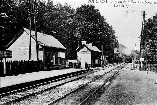 Reproductie van een postkaart met als opschrift 'Boitsfort Station de la Forêt de Soignes (Block 7)'. Bovenaan rechts staat een handgeschreven boodschap. De postkaart toont de zij- en achtergevel van het station. De rolbareel van de overweg ernaast is gesloten. Een reizigerstrein, vermoedelijk gesleept door een stoomlocomotief type 10 (2C1 Pacific), nadert het station. Het spoorwegdomein is met afgedankte dwarsliggers afgesloten. Links en rechts van de spoorlijn staan telefoon- en telegraafpalen opgesteld. Naast de overweg zien we de woning van de baanwachter.
