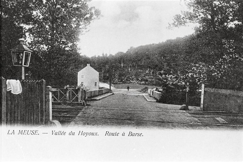 Reproductie van een postkaart met als opschrift 'La Meuse. - Vallée du Hoyoux. Route à Barse.' De postkaart toont een overweg op spoorlijn 126 (Ciney - Modave - Statte). De rolbareel is geopend. Voor de verlichting van de overweg worden petroleumlantaarns gebruikt.