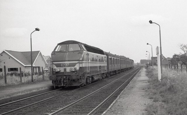 Diesellocomotief 6237 staat met een reizigerstrein aan het perron in station Baasrode-Zuid. De trein is samengesteld uit een aantal L-rijtuigen. Op beide perrons zien we lantaarnpalen. Baasrode-Zuid ligt langs spoorlijn 53 (Gent - Mechelen - Leuven). Schenking van Myriam Hendrickx.