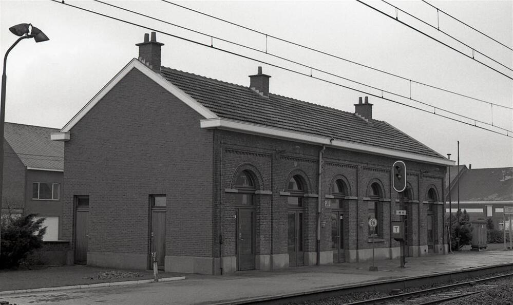 We zien de achtergevel van het station, getrokken van over de sporen. Voor het stationsgebouw zien we een stopsein type I. Aan de paal van dit sein is een telefoonkast gemonteerd (kast met 'T' erop). Vóór dit sein zien we een paaltje met een wit bord met een zwart cijfer erin. Dit cijfer geeft het nummer van de overweg weer. Schenking van Myriam Hendrickx.