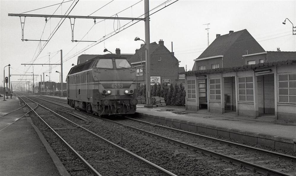 Deze locomotief behoort tot de reeks 62. Rechts zien we een schuilhuisje op het perron. Links staat op het perron een stopsein en verbindt een wissel het hoofdspoor met de goederenkoer over het perron heen.