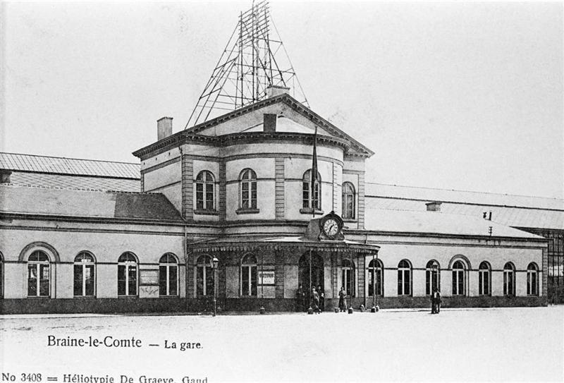 Reproductie van een postkaart met als opschrift 'Braine-le-Comte - La gare.' en als uitgever 'N° 3408 = Héliotype De Graeve Gand'. De postkaart toont de voorgevel van het station met de typische rondboogvorm voor ramen en deuren. Het centrale deel is uitgerust met een luifel, stationsklok en een telefoon- en telegraafmast. Achter het gebouw zien we de perronoverkapping.