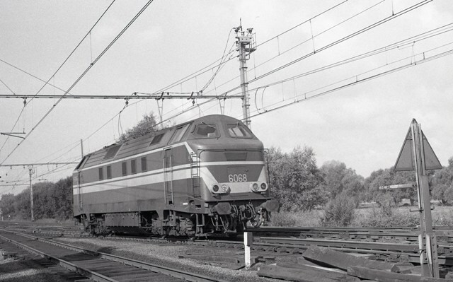 Diesellocomotief 6068 rijdt als losse locomotief over een wissel in de buurt van Saint-Ghislain. Vooraan rechts zien we een seinbord, vermoedelijk een snelheidsbord. Saint-Ghislain ligt aan de samenkomst van lijn 97 (Bergen - Franse grens) en lijn 78 (Doornik - Bergen). Schenking van Myriam Hendrickx.