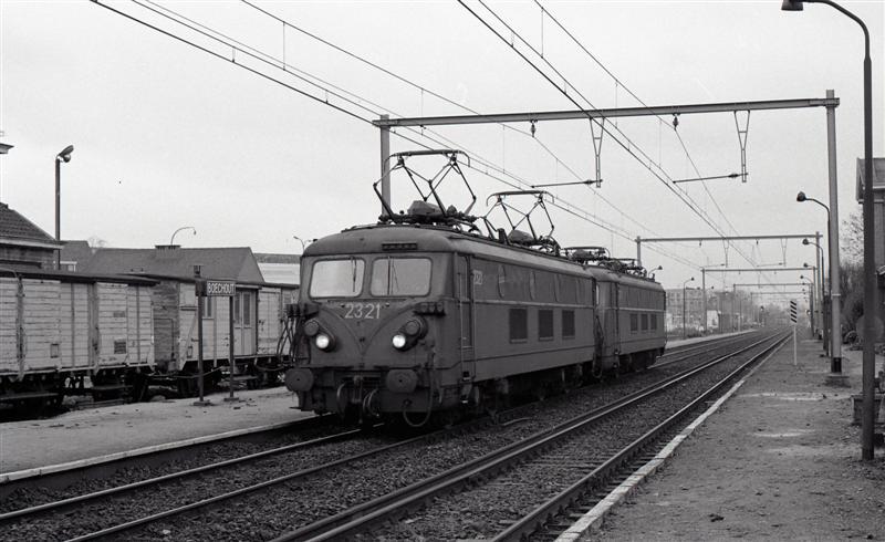 Deze locomotief behoort tot de reeks 23. Zij heeft een locomotief van dezelfde reeks aan de haak en beiden voeren ze testritten uit op de pas geëlektrificeerde lijn 15. De locomotieven rijden op tegenspoor (rechts van de rijrichting). Links zien we houten gesloten goederenwagens die gebruikt worden als dienstlokaal. Op de perrons zijn een stationsnaambord een mistbaken te zien. Schenking van Myriam Hendrickx.