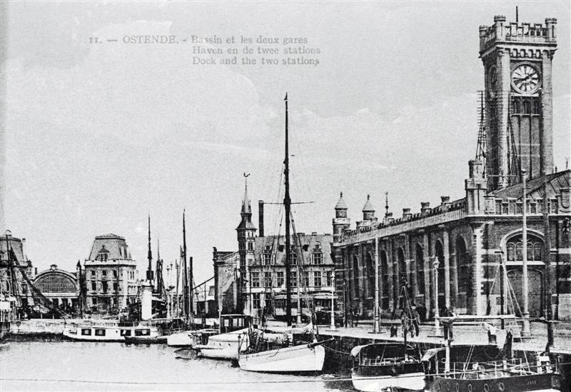 Reproductie van een postkaart met als opschrift '11. - Ostende. - Bassin et les deux gares Haven en de twee stations Dock and the two stations'. De postkaart toont de uurwerktoren en zijgevel van het station in neogotische stijl. Op het dak van het gebouw staat een telefoon- en telegraafmast opgesteld. In de haven liggen zeilschepen voor anker. Op de achtergrond zien we het station Oostende-Kaai.