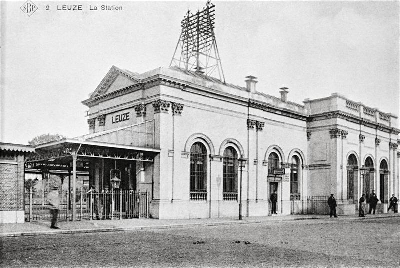 Reproductie van een postkaart met als opschrift '2 Leuze La Station'. Voor het opschrift staat het logo van de uitgever. De postkaart toont de voor- en zijgevel van het station met luifel en neoclassicistische elementen. Op het dak staat een telefoon- en telegraafmast opgesteld. Personeelsleden en toevallige voorbijgangers kijken in de richting van de fotograaf.