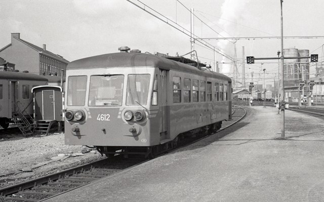 Motorwagen 4612 staat aan het perron in station La Louvière. Op het perron zijn de AVG-signalen duidelijk te zien. Links van de motorwagen zien we rijtuigen van een werktrein en rechts verderop staan lichtseinen. Op de achtergrond zien we nog een werktrein en installaties die behoren tot de industriële verwerkingsnijverheid te La Louvière. Schenking van Myriam Hendrickx.