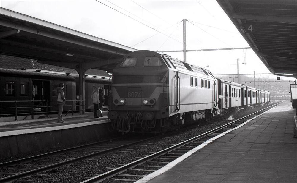 Deze locomotief behoort tot de reeks 60. Zij heeft een reizigerstrein bestaande uit M 1-rijtuigen aan de haak en komt toe aan perron 3. De perrons zijn gedeeltelijk overdekt door een luifel. Links zien we de toegang via trappen naar de onderdoorgang. Enkele reizigers staan te wachten op de toekomende trein. Aan het tweede perron staat reeds een reizigerstrein met open deuren. Schenking van Myriam Hendrickx.