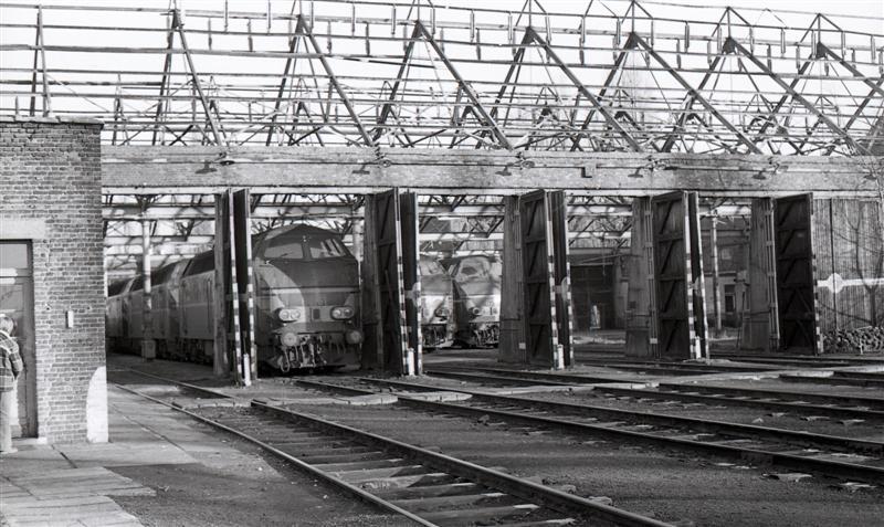De foto toont de locomotievenloods waarvan de daken net verwijderd zijn. Op 2 maart 1984 werd de stelplaats gesloten en in december 1985 afgebroken. In de loods staan locomotieven van de reeks 62/63. De locomotieven zijn groen geschilderd met gele zichtbaarheidsstrepen. Schenking van Myriam Hendrickx.