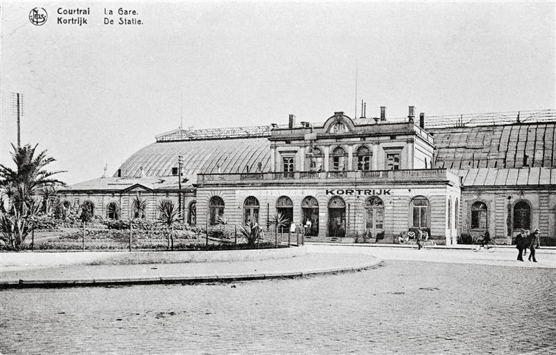 Reproductie van een postkaart met als opschrift 'Courtrai La Gare. Kortrijk De Statie.' Voor het opschrift staat het logo van de uitgever. De postkaart toont de voorgevel van het station met het uurwerk in een gebogen fronton. Achter het gebouw zien we de perronoverkapping. Op het stationsplein is een rotonde met een plantsoen aangelegd.