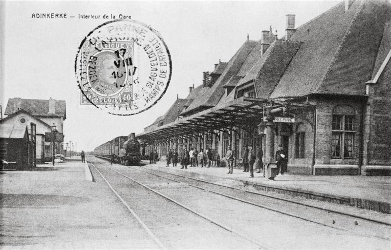 Reproductie van een postkaart met als opschrift 'Adinkerke - Intérieur de la Gare'. Centraal zien we een afgestempelde postzegel. De postkaart toont de zij- en achtergevel van het tweede station met perronluifel. Aan de overzijde zien we nog het eerste stationsgebouw. Aan het perron staat een reizigerstrein, vermoedelijk gesleept door een stoomlocomotief type 32 (C Bourbonnais). De dwarsliggers zijn met ballast bedekt. Personeel en reizigers kijken in de richting van de fotograaf.