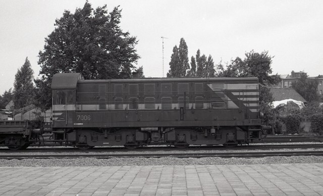 BeschrijvingDeze fotogroep bevat twee negatieven. Ze tonen rangeerlocomotief 7006 die een goederentrein sleept in de buurt van station Lier. De eerste goederenwagen is een platte wagen.