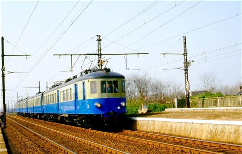 Deze fotogroep bevat vier dia's. Het elektrisch motorstel uit 1935 komt aan in het station Eppegem. Op een ander beeld is de achterkant van het treinstel te zien. We hebben ook zicht op de perrons, een stationsnaambord, de achterzijde van een lichtsein en een 'krokodil' tussen de sporen. Schenking van Myriam Hendrickx.