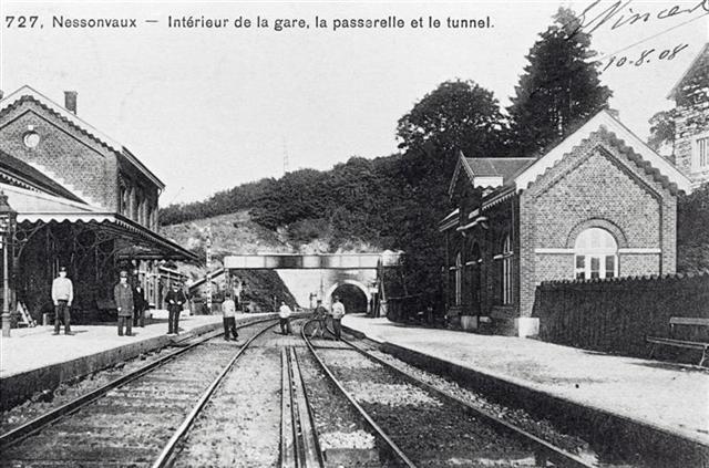 Reproductie van een postkaart met als opschrift '727, Nessonvaux - Intérieur de la gare, la passerelle et le tunnel.' Bovenaan staat een met de hand geschreven naam en datum. De postkaart toont de zij- en achtergevel van het station met luifel en de voetgangersbrug. Voor deze brug staat links een mechanisch sein opgesteld. Het stationspersoneel poseert voor de fotograaf. Op het perron tegenover het station zien we een schuilhuisje, een zitbank en een afsluiting bestaande uit afgedankte dwarsliggers. Op de achtergrond bevindt zich de ingang van de tunnel.