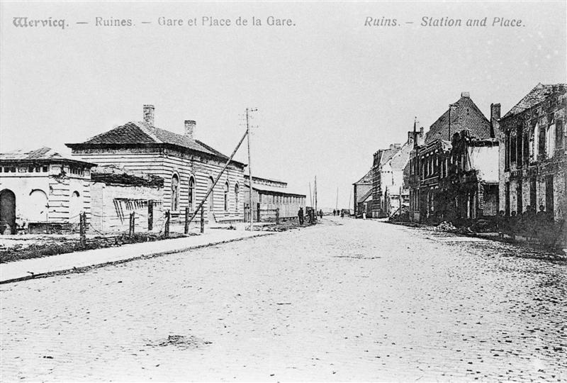 Reproductie van een postkaart met als opschrift 'Wervicq. - Ruines - Gare et Place de la Gare. Ruins. - Station and Place.' De postkaart toont de zij- en voorgevel van het door de oorlog zwaar beschadigde station. Aan de overzijde liggen huizen in puin. In de schaduw ervan poseren enkele bewoners voor de fotograaf.