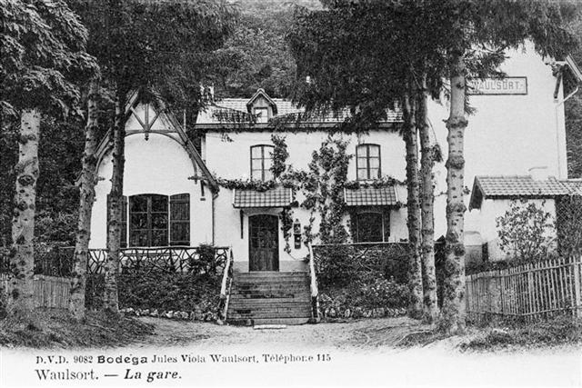 BeschrijvingReproductie van een postkaart met als opschrift 'Waulsort. - La gare.' en als uitgever 'D.V.D. 9082 Bodega Jules Viola Waulsort. Téléphone 115'. De postkaart toont de voorgevel van het station. Het gebouw doet door zijn cottage-stijl aan een villa denken.