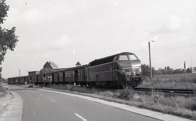 Diesellocomotief 6245 rijdt met een reizigerstrein voorbij een bewaakte overweg in de buurt van station Neerpelt. De trein bestaat uit vijf M 1-rijtuigen. Aan weerszijden van de overweg zien we een andreaskruis.