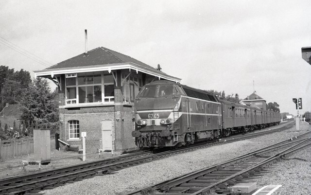 Diesellocomotief 6245 rijdt met een reizigerstrein voorbij de seinpost in station Neerpelt. De trein bestaat uit vijf M 1-rijtuigen. Voor de locomotief zien we een hectometerpaal '3'. Vooraan op de foto, op de andere sporen, zien we apparatuur met nummer '8' voor de elektrische aandrijving van wissels. Station Neerpelt ligt langs de lijn 19 (Mol - Nederlandse grens). Schenking van Myriam Hendrickx.