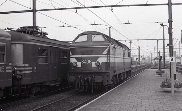 Diesellocomotief 6406 staat als losse locomotief aan het perron in station Hasselt. Op het spoor daarnaast zien we een deel van motorstel 115. Motorstel 115 behoort tot de reeks 00, schijf 1954. Op de perrons staan bloembakken en verderop zien we lichtseinen. Schenking van Myriam Hendrickx.