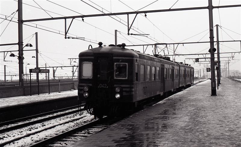 Dit tweeledig motorstel behoort tot de reeks 00 schijf 1953. Rechts van dit motorstel zien we de AVG (Aanwijzer Verrichtingen Gedaan). Dit is het zwarte vierkantje met zes witte lichten in cirkelvorm opgesteld. Het is bevestigd aan de bovenleidingpaal. Wanneer deze zes witte lichten branden dan weet de machinist dat de trein veilig kan vertrekken (reizigers veilig opgestapt en deuren dicht). Deze AVG wordt van op het perron bediend door de treinbegeleider. Schenking van Myriam Hendrickx.