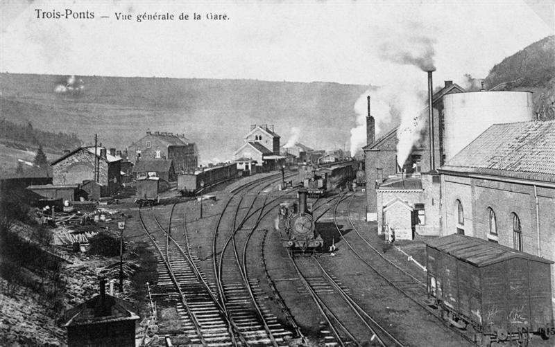 Deze dia is een reproductie van een postkaart met als opschrift 'Trois-Ponts - Vue générale de la Gare.' De postkaart toont de sporenbundel van het station met een stoomlocomotief type 29 (C Bourbonnais) en een tenderlocomotief type 51 (Ct). Links staan op een zijspoor enkele rijtuigen opgesteld. Rechts zien we een gesloten goederenwagen, de watertoren en locomotievenloods. Op de achtergrond bevinden zich het stationsgebouw en de beboste hellingen van de vallei van de Amblève.