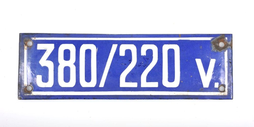 BeschrijvingBlauw bord met witte cijfers, dat het voltage van een elektriciteitskabel weergeeft.