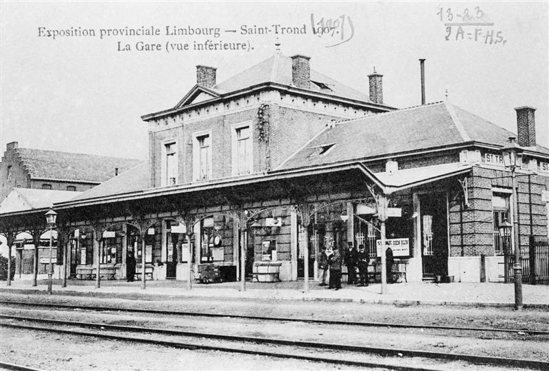 Reproductie van een postkaart met als opschrift 'Exposition provinciale Limbourg - Saint-Trond 1907. La Gare (vue intérieure).' Bovenaan staan met de hand geschreven gegevens. De postkaart toont de zij- en achtergevel van het tweede stationsgebouw. Op het perron poseren personeelsleden ander de luifel. De dwarsliggers zijn met ballast bedekt. De perronverlichting bestaat uit petroleumlantaarns.