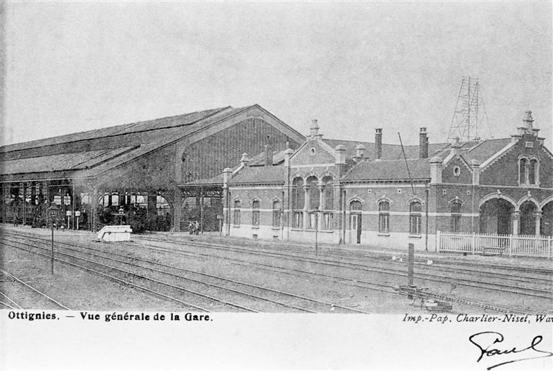 Reproductie van een postkaart met als opschrift 'Ottignies. - Vue générale de la Gare.' en als uitgever 'Imp.-Pap. Charlier-Niset, Wavre.' Onderaan staat een met de hand geschreven naam. De postkaart toont de zij- en voorgevel van het station met puntgevels bekroond door sluitstenen. Op het dak staat een telefoon- en telegraafmast opgesteld. Voor de perronoverkapping zien we een stootblok. De dwarsliggers zijn met ballast bedekt.