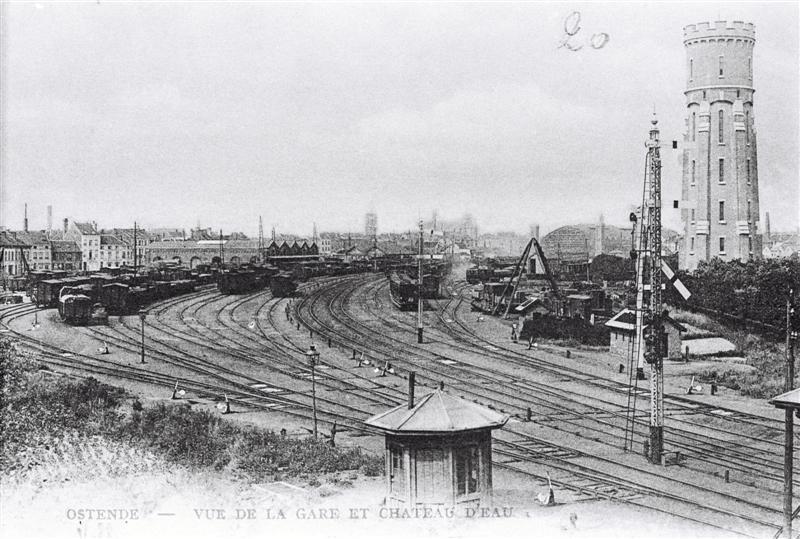 Reproductie van een postkaart met als opschrift 'Ostende - Vue de la Gare et chateau d'eau'. De postkaart toont de sporenbundel vol rollend materieel. Naast de sporen staan petroleumlantaarns en mechanische seinen opgesteld. Rechts zien we de watertoren. Vooraan bevindt zich een seinpost. Op de achtergrond zijn de stelplaats en de overkapping van het kopstation nog net zichtbaar.