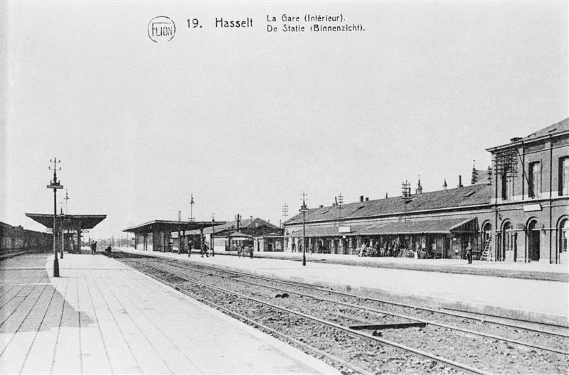 Reproductie van een postkaart met als opschrift '19. Hasselt La Gare (Intérieur). De Statie (Binnenzicht).' Voor het opschrift staat het logo van de uitgever. De postkaart toont de achtergevel van het station. De perrons zijn recent heraangelegd en uitgerust met luifels en elektrische verlichting. Links staat een reizigerstrein, vermoedelijk samengesteld uit GCI-rijtuigen, klaar om te vertrekken. De dwarsliggers zijn met ballast bedekt.