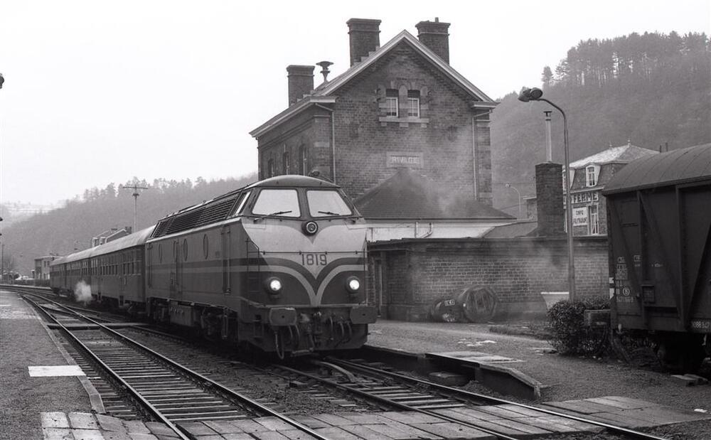 Deze diesellocomotief heeft Luxemburgse rijtuigen aan de haak en verzekert de internationale verbinding 'Luxemburg - Luik'. Deze relatie werd ook soms met Belgisch materieel gereden. Vóór de locomotief zien we een spoorovergang voor reizigers. Rechts zien we een deel van een gesloten goederenwagen. Schenking van Myriam Hendrickx.