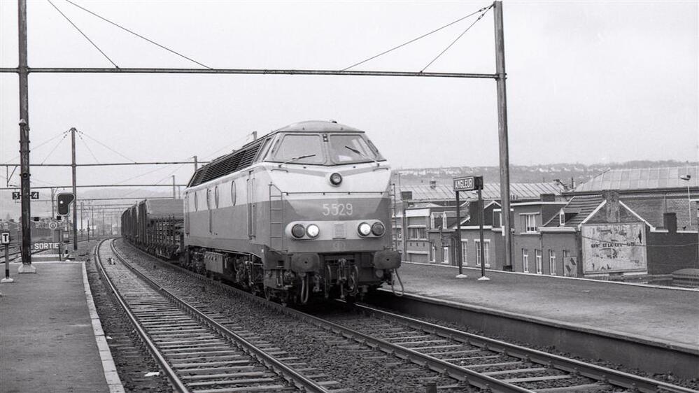 Deze locomotief behoort tot de reeks 55 en heeft een goederentrein aan de haak. Links zien we een stopsein van het type II op het einde van perron 4. Rechts van de locomotief staat een stationsnaambord op het perron. De portieken van de bovenleiding zijn reeds geplaatst, maar nog zonder bedrading. Schenking van Myriam Hendrickx.