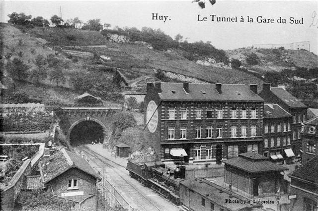 Reproductie van een postkaart met als opschrift ' Huy. Le Tunnel à la Gare du Sud' en als uitgever 'Phototypie Liégoise'. De postkaart toont de enkelsporige tunnel van 75 meter lengte. Rechts van de tunnel zien we enkele woningen, het toiletgebouw en een deel van de achtergevel van het station. Op het spoor staat een stoomlocomotief type 28 of 29 (C Bourbonnais) met vermoedelijk een reizigerstrein. Op de achtergrond bevindt zich bovenop de heuvel de citadel van Hoei.