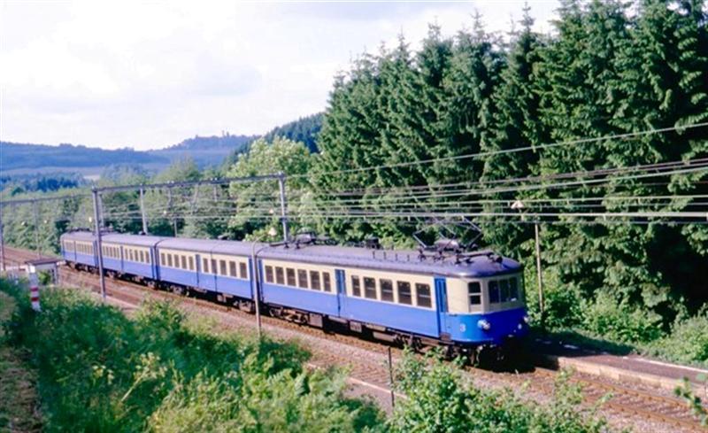 Deze fotogroep bevat vier dia's. De eerste foto toont het motorstel type 1935 aan het perron, het volgende beeld laat het treinstel zien op volle baan in de omgeving van Lesterny. Hier zien we duidelijk de snelheidsseinen '10' langs de kant van de sporen. Dit wil zeggen dat treinen vanaf dit punt hun snelheid moeten verlagen tot 100 km/u. Schenking van Myriam Hendrickx.