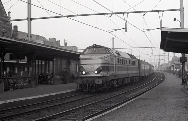 Diesellocomotief 5109 staat met een reizigerstrein aan perron drie in station Jette. Zij sleept M 2-rijtuigen. We zien reizigers op het perron en in de overdekte wachtruimte. Station Jette is het station waar lijn 50 (Brussel-Noord - Gent-Sint-Pieters) en lijn 60 (Brussel-Noord - Dendermonde) splitsen. Schenking van Myriam Hendrickx.