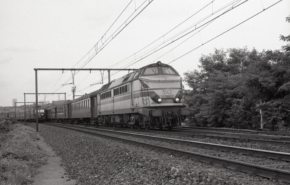 We zien diesellocomotief 5142 met een reizigerstrein in de omgeving van Vorst. De trein bestaat uit een sleep K-rijtuigen. Op het spoor daarnaast sleept elektrische locomotief 2802 een aantal M 2-rijtuigen.