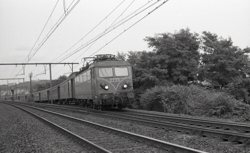 BeschrijvingElektrische locomotief 2223 sleept een reizigerstrein op het hoofdspoor in de omgeving van Vorst. De sleep bestaat uit K-rijtuigen. Het eerste rijtuig is een pakwagen.