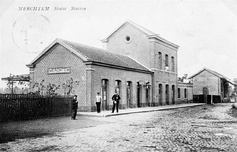 Reproductie van een postkaart met als opschrift 'Merchtem Statie Station' en als uitgever 'Uitg. A. Asselman De Moor'. De postkaart toont de voor- en zijgevel van het station met luifel. Drie personeelsleden poseren voor de fotograaf, die zich aan de overzijde van het stationsplein bevindt. Rechts zien we de goederenloods en een afsluiting bestaande uit afgedankte dwarsliggers. Een houten hek sluit het perron van het openbaar domein af.