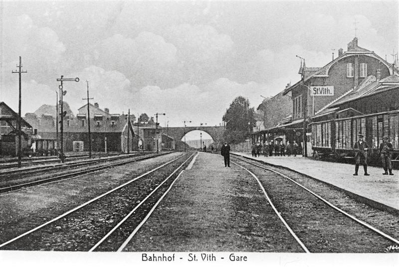 Reproductie van een postkaart met als opschrift 'Bahnhof - St. Vith -Gare'. De postkaart toont de zij- en achtergevel van het station met luifel. Op het perron poseren personeelsleden en twee arbeiders voor de fotograaf. Langsheen de sporen staan mechanische seinen van het Duitse type. Rechts van het station bevindt zich de goederenloods met drie gesloten goederenwagens. Links zien we de locomotievenloods. De dwarsliggers zijn met ballast bedekt. Over de sporen loopt op de achtergrond een viaduct.
