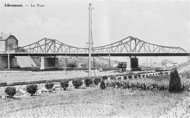 Reproductie van een postkaart met als opschrift 'Libramont. - Le Pont'. De postkaart toont de brug over de sporenbundel en een perron waarop een metalen paal in vakwerk staat met de naam van het station. Op de achtergrond zien we twee stoomlocomotieven en enkele mechanische seinen.
