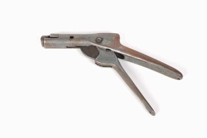 BeschrijvingNijptang voor het beveiligd afsluiten van geldzakken, kisten, sleutelkasten, enz. door middel van aluminium zegels. Bij het dichtknijpen bracht de tang een merkteken aan op het zegel.