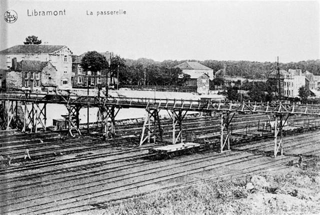 Reproductie van een postkaart met als opschrift 'Libramont La passerelle'. Voor het opschrift staat het logo van de uitgever. De postkaart toont de houten noodbrug over de sporenbundel, die het dorpscentrum met de stationsbuurt verbond. Deze voetgangersbrug werd nadien door een wegbrug met metalen bovenbouw vervangen. Op de sporenbundel staan open goederenwagens opgesteld.