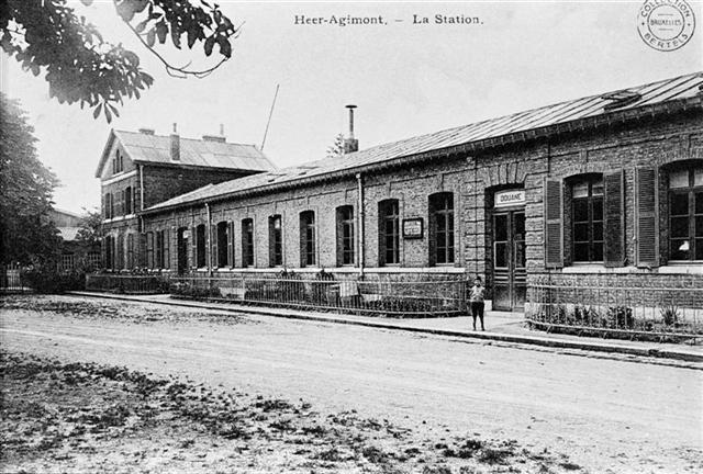 Reproductie van een postkaart met als opschrift 'Heer-Agimont. - La Station.' Bovenaan rechts staat het logo van de uitgever. De postkaart toont de voorgevel van het grensstation. Een jongen poseert voor het douanekantoor. Een afsluiting in smeedijzer schermt de bloemperken af.