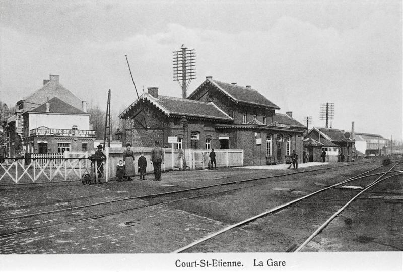 Reproductie van een postkaart met als opschrift 'Court-St-Etienne. La Gare'. De postkaart toont de zij- en achtergevel van het station. Personeelsleden en voorbijgangers poseren voor de fotograaf die zich aan de overzijde van de sporen bevindt. De rolbareel is gesloten. De dwarsliggers tussen de sporen zijn met ballast bedekt. Op het einde van het perron staat een mechanisch stopsein met ronde schijf. Achter het stationsgebouw zien we twee telefoon- en telegraafmasten.