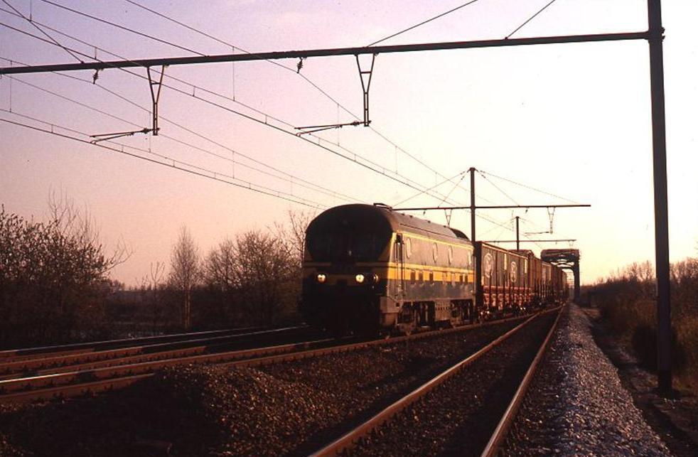 BeschrijvingEen diesellocomotief reeks 59 sleept een containertrein. Op de achtergrond zien we een stalen spoorwegbrug.