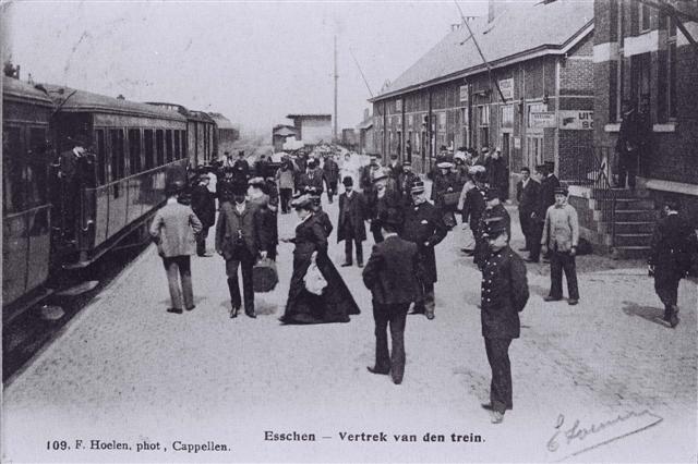 Reproductie van een postkaart met als opschrift 'Esschen - Vertrek van den trein.' en als uitgever '109. F. Hoelen. phot , Cappellen.' Onderaan rechts staat een handtekening. De postkaart toont het douanekantoor en een deel van de achtergevel van het station. De reizigers met bestemming België begeven zich na de controle door de douane naar de trein die langsheen het perron staat opgesteld. Enkele personeelsleden en reizigers hebben de fotograaf opgemerkt. De trein is samengesteld uit rijtuigen met kopdeuren en een bagagewagen met bovenbouw.