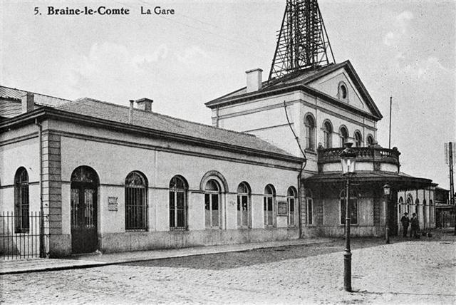 Reproductie van een postkaart met als opschrift '5. Braine-le-Comte La Gare'. De postkaart toont de voor- en zijgevel van het station met een luifel en balustrade boven de toegang. De ramen en deuren zijn rondbogig. Bovenop het dak met fronton staat een telefoon- en telegraafmast. Voor de verlichting van het stationsplein worden gaslantaarns gebruikt.